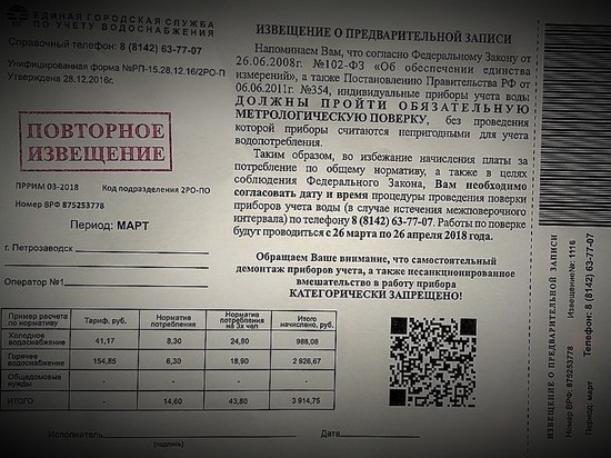 Но копии наглого произведения доморощенного маркетолога вновь обнаружены в почтовых ящиках жителей Петрозаводска. На этот раз сообщается, что якобы некие работы по замене приборов учета воды будут проводиться с 26 марта по 26 апреля 2018 года.