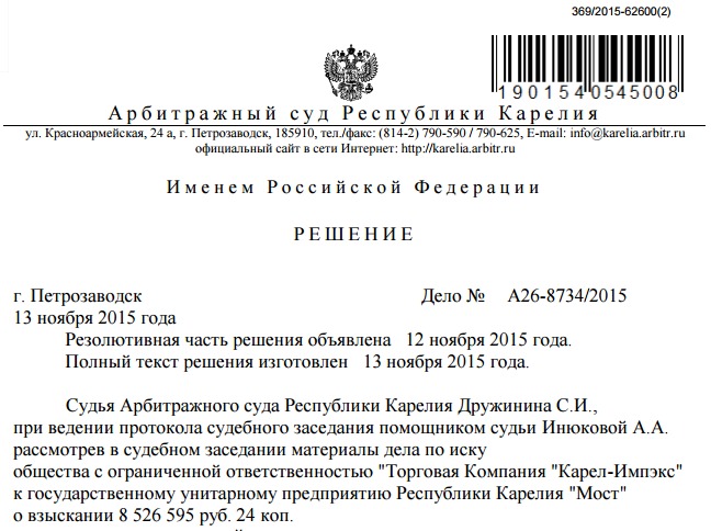 ГУП РК «Мост», находящемуся в предбанкротном состоянии, придется заплатить более 8,5 миллиона рублей задолженности карельской торговой компании: такое решение 12 ноября принял Арбитражный суд Карелия, удовлетворив иск фирмы «Карел-Импэкс».