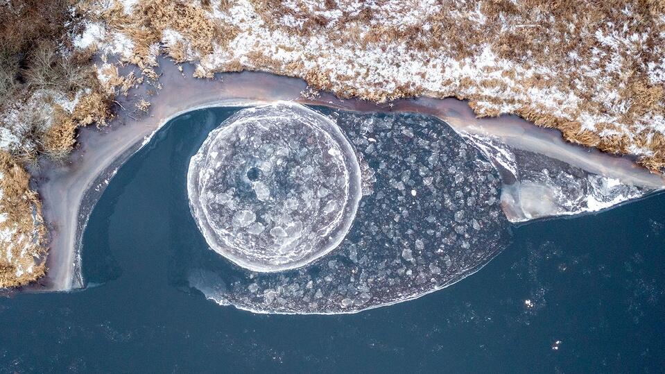 «Ездили в село Видлица за интервью к Виктору Степанову. Путь был через Олонецкий район. На реке Олонка была замечена льдина очень правильной круглой формы - ледяная тарелка. Утром она крутилась, но времени у нас не было. А на обратном пути мы сделали остановку. Льдинка уже не вращалась, смерзлась, но интриговала. При съемке сверху стало понятно, что это так называемое "улово" с обратным течением реки», - рассказал историю фото автор.