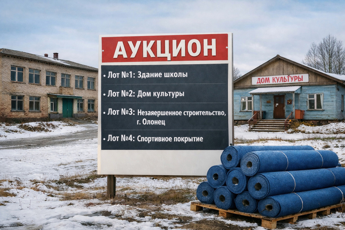 Среди выставленного имущества — бывшее здание школы в поселке Ковера и Дом культуры в деревне Рыпушкалицы. Также на торги выставлены незавершенное строительство в Олонце и рулонное спортивное покрытие.