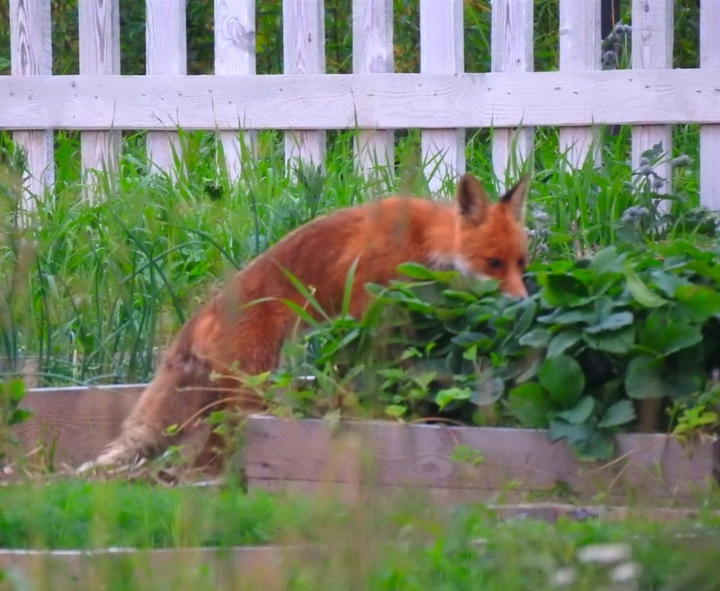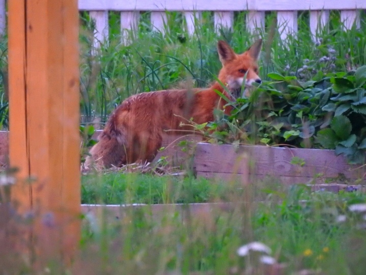 Жительница Питкярантского района заметила лиса, который лакомится клубникой с грядки. Женщина успела запечатлеть любителя ягод.