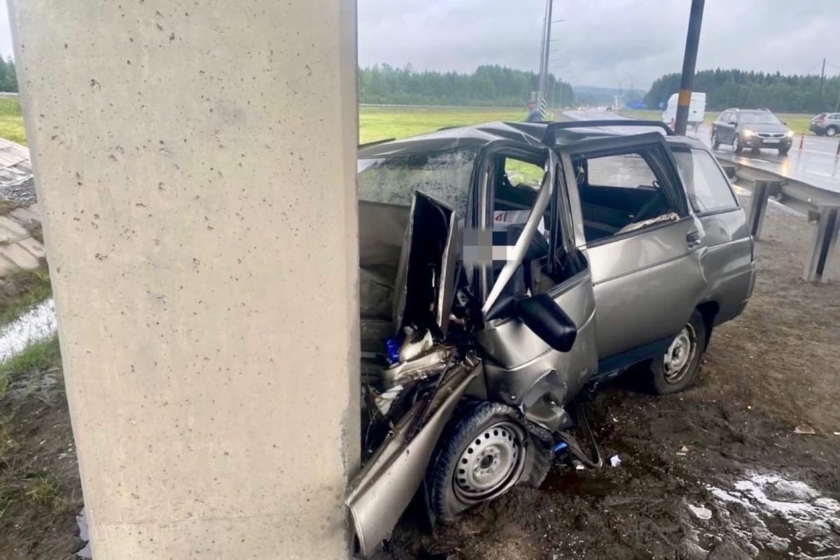 По предварительным данным, водитель автомобиля «ВАЗ-21110» не справился с управлением в дождливую погоду, съехал с дороги и пробил опору моста.