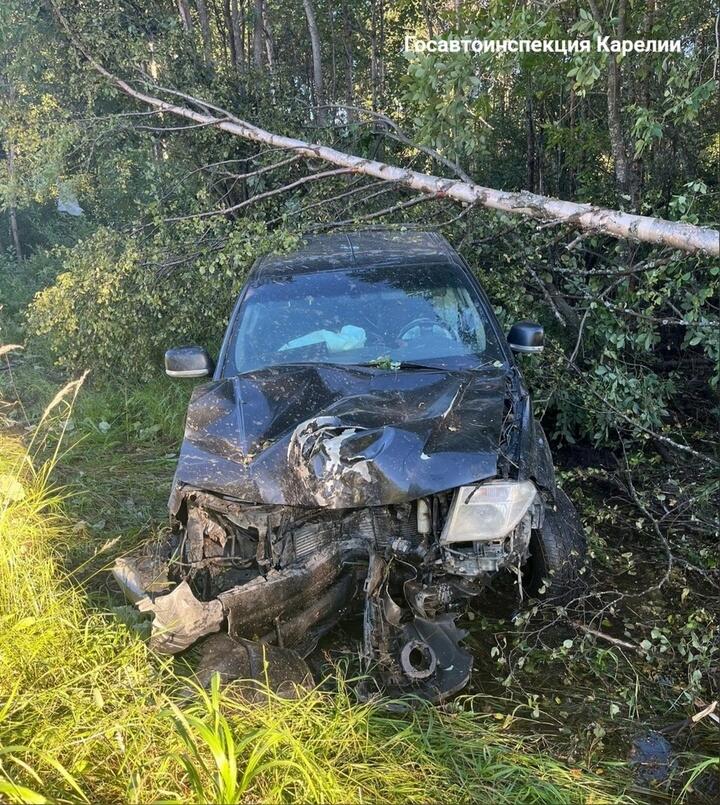 Похожая авария случилась 20 августа в 17:15 в Костомукше. Нетрезвый водитель Nissan Navara улетел в кювет и врезался в дерево. Машина разбилась, водителя госпитализировали.
