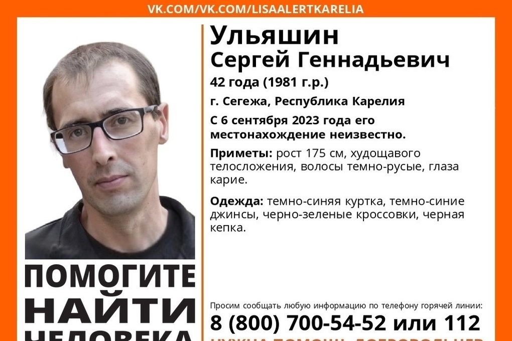 Как сообщили в поисковом отряде «ЛизаАлерт» Карелии, 6 сентября в Сегеже пропал 42-летний Ульяшин Сергей Геннадьевич.