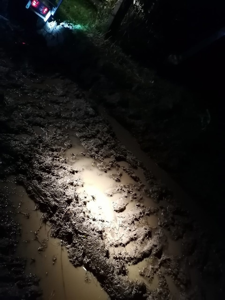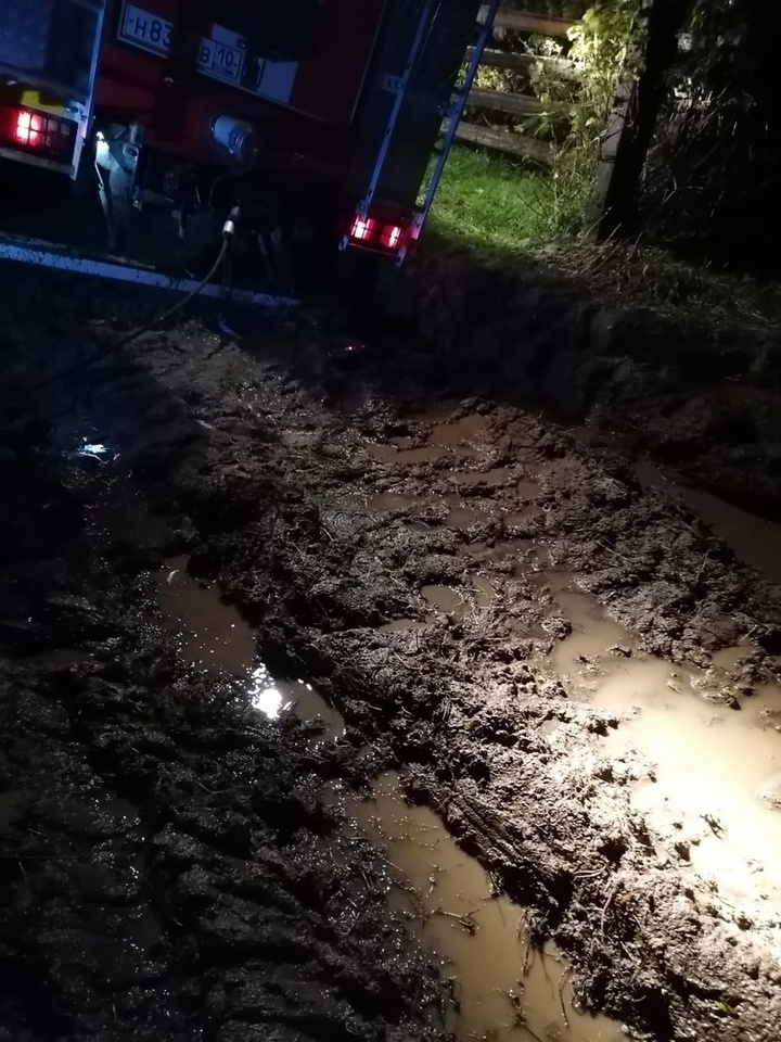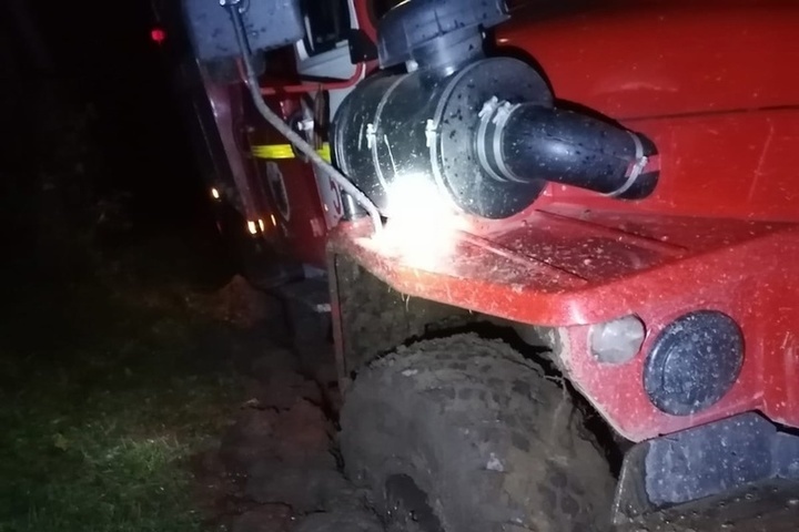 На место происшествия выехала команда огнеборцев из Пудожа, но по пути одна из машин увязла в грязи: