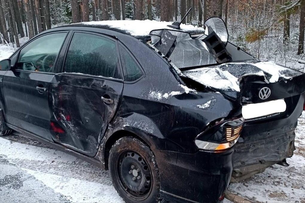 Женщина за рулем Volkswagen Polo не учла дорожные и погодные условия, съехала в кювет и столкнулась с препятствием.