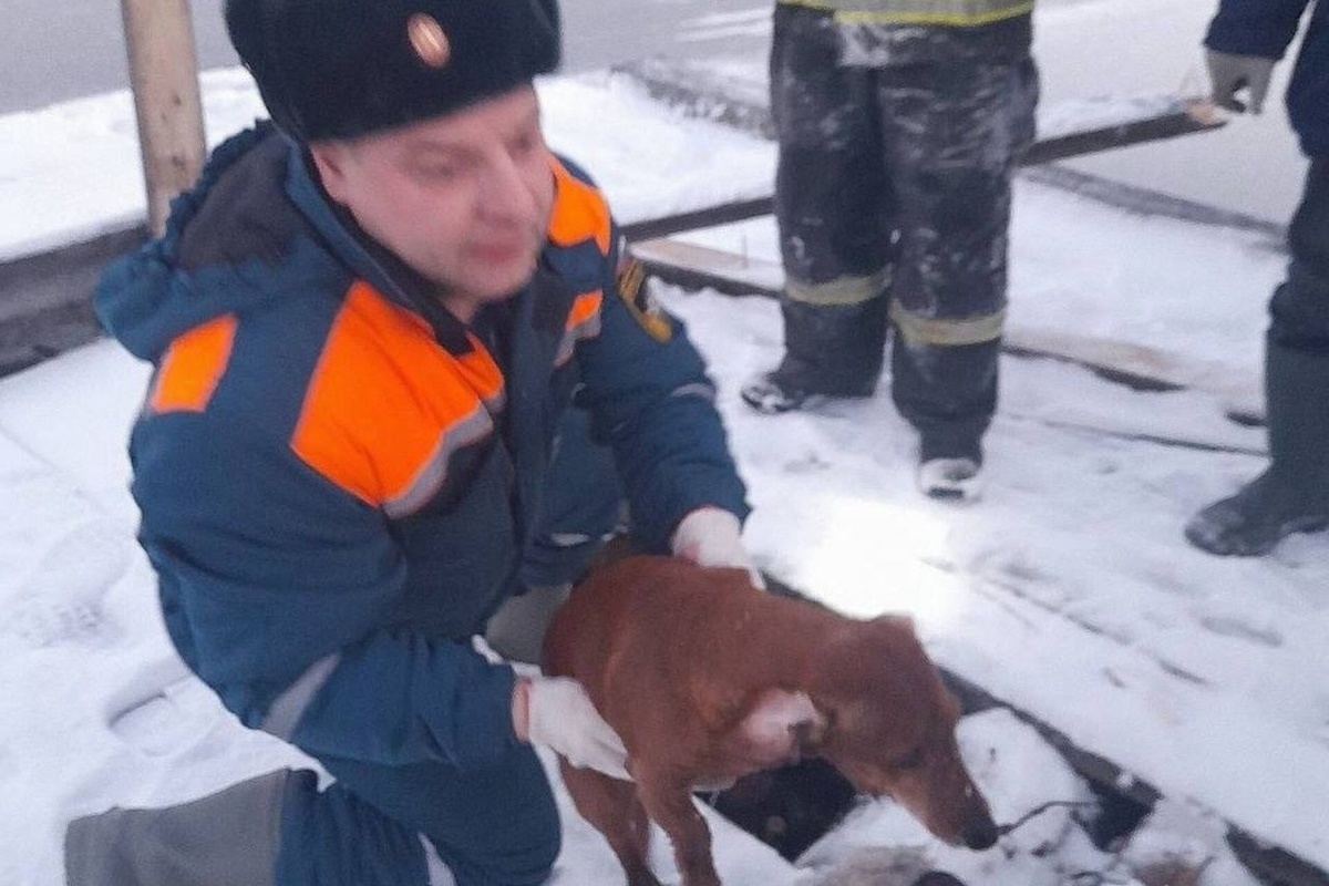 Специалист МЧС прополз между узкими конструкциями и спас собаку.