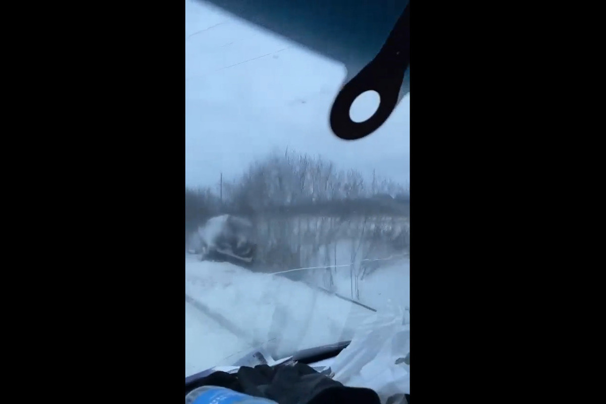 Очевидцы поделились видео с места ДТП, на котором видно внедорожник УАЗ Патриот, застрявший в огромном сугробе на обочине.