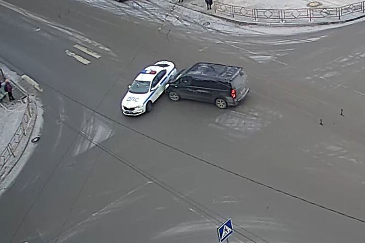 На записи видно, как патрульный автомобиль ДПС выехал на перекресток с включенными проблесковыми маячками и начал разворачиваться. В это время на светофоре загорелся «зеленый», и водитель черного минивэна выехал на перекресток. Однако водитель патрульного авто продолжил поворачивать, после чего произошло столкновение.
