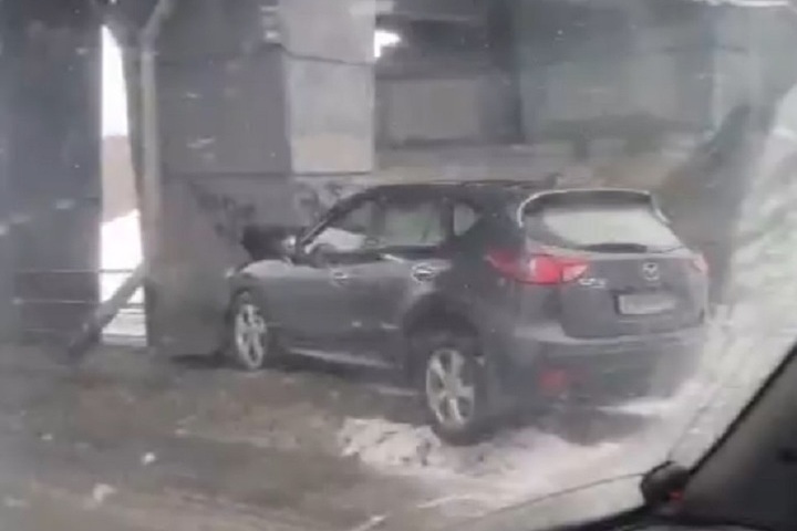 Автомобиль «Мазда» в Петрозаводске въехал в опору моста. Последствия ДТП попали на видео, которое выложили в паблик «Подслушано у водителей Птз и Карелии».