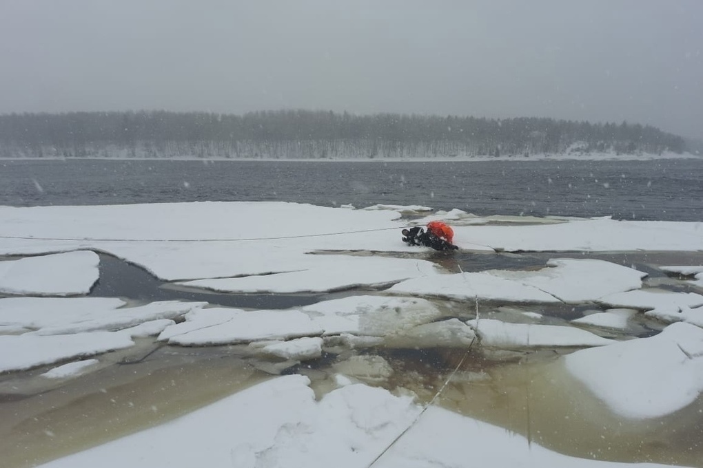 Оттачивать профессиональные навыки спасателям помогал водолаз. Он погружался в ледяную воду, после чего профессионалы доставали его на сушу.