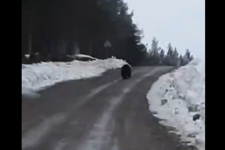 В паблике Лоухского лесничества опубликовано видео, как медведь бежит по лесной дороге.