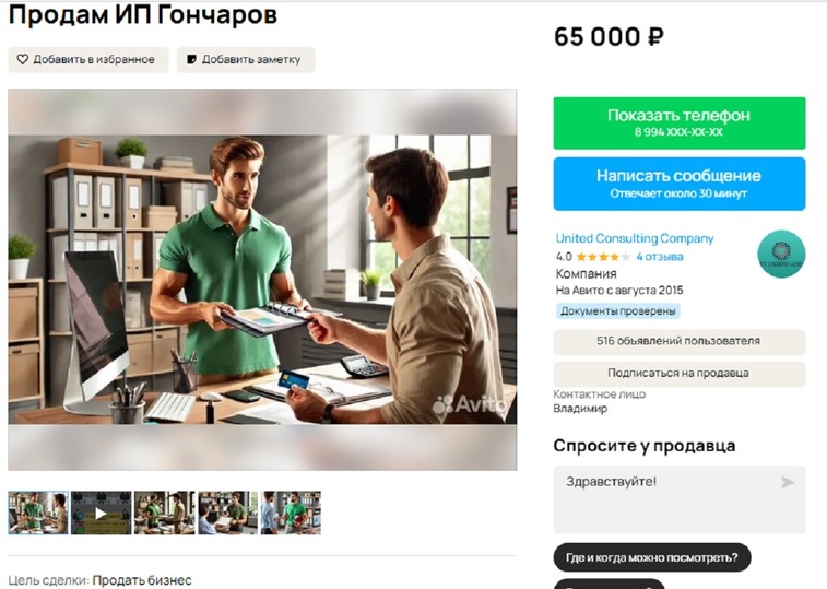 Как показало расследование, подобные объявления от некоего ИП Гончарова публиковались более чем в 30 регионах страны — и, возможно, находили своих жертв. Сейчас объявления исчезли, зато стало известно, что сам ИП Гончаров продается. То есть документы индивидуального предпринимателя, наверняка оформленные на подставное лицо, «продавцы» готовы за наличный расчет передать любому желающему для дальнейшего использования.