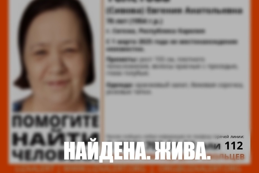 1 марта 70-летняя Евгения Толстова самовольно ушла из больницы, одетая только в халат и тапочки. Информация о её исчезновении быстро распространилась в соцсетях, и поисковики отряда «Длинный берег. Сегежа» вместе с родственниками пенсионерки начали поиски.