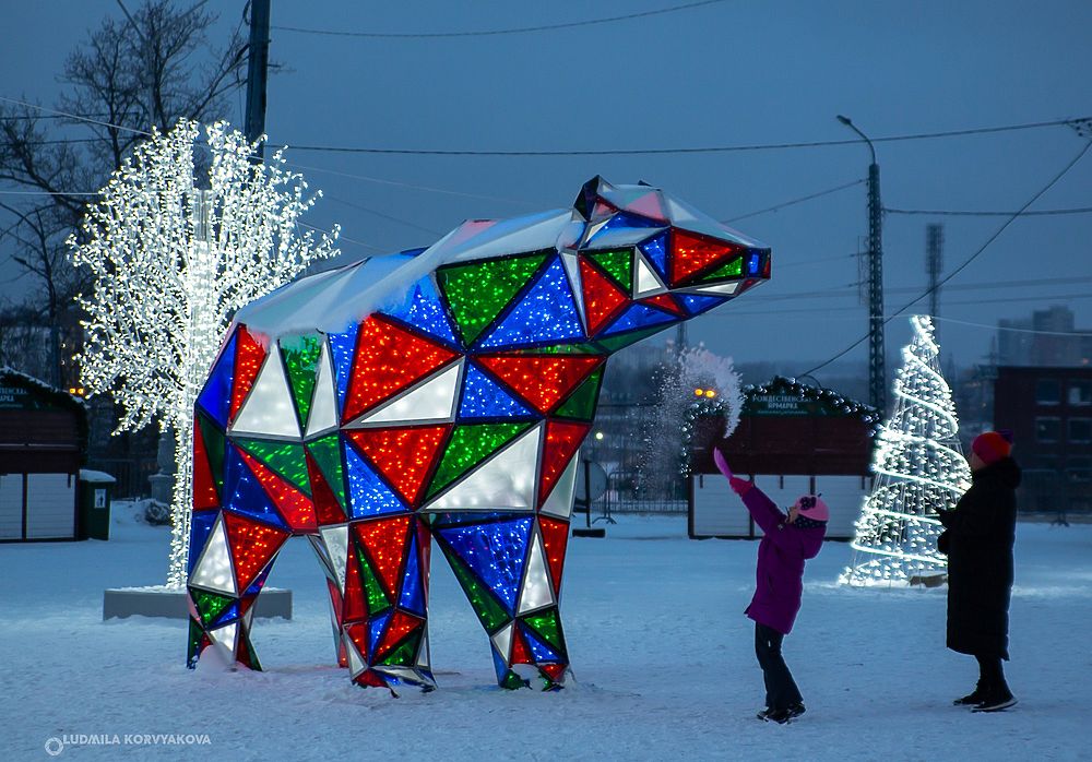 Преобразилась в преддверии новогодних праздников и столица Карелии. Вечерний город, особенно в центре, напоминает сказку. На площади Кирова высится 18-метровая искусственная ель, напоминающая невесту, а все из-за светового шатра из гирлянд. Наконец-то на площади появился и обещанный трехметровый световой медведь, выполненный в цветах карельского флага. А еще там установили световую птицу, которая, как и хозяин леса, является символом 100-летия республики. Правда, в этом случае разгадать символичный образ нам не удалось.