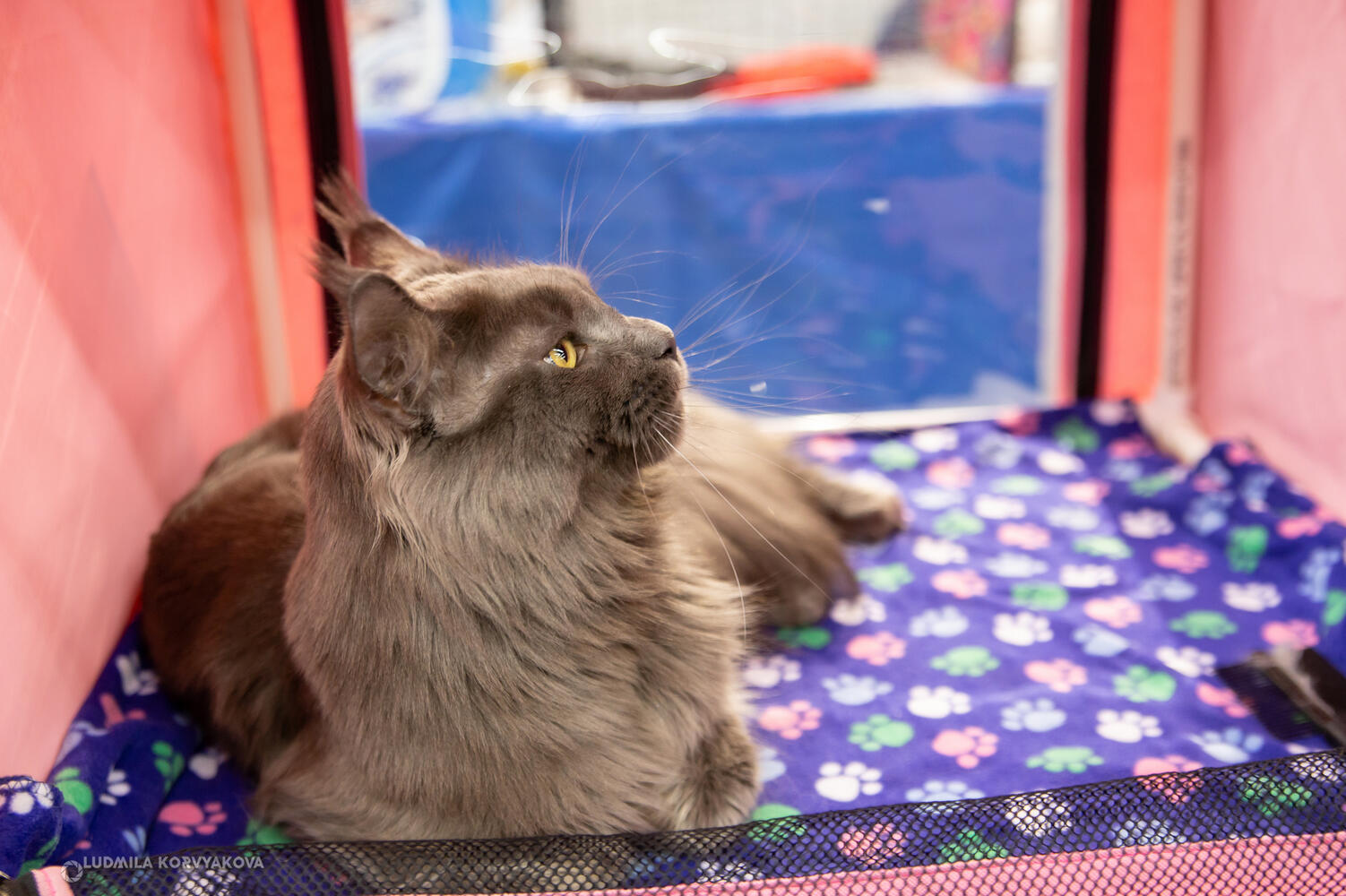 Но чтобы избавить животных от стресса организаторы и заводчики все-таки не дают всем подряд гладить своих питомцев и закрывают шторкой кошек, которым нужно передохнуть от чужого внимания. Большинство четвероногих в перерывах между соревнованиями отдыхают: не спят в основном только котята, пучащие любопытные глазки на людей.