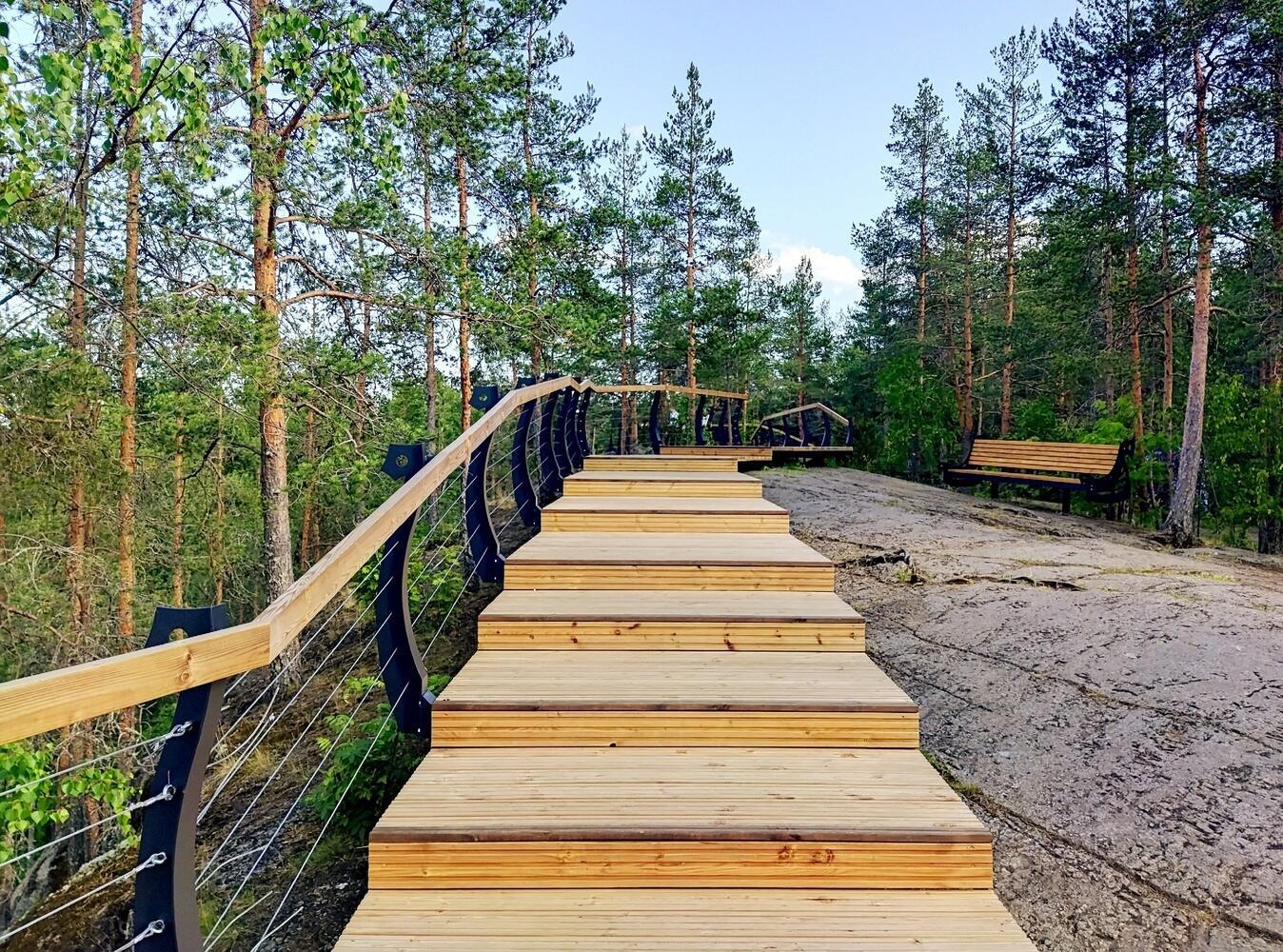 На вершину горы сейчас ведёт широкая, удобная и довольно стильная лестница, а на самой вершине построена просторная смотровая площадка. На скалах появились арт-объекты, посвящённые героям "Калевалы", среди которых особенно выделяется настоящее кантеле. Туристы уже стали складывать в него монетки на счастье.
