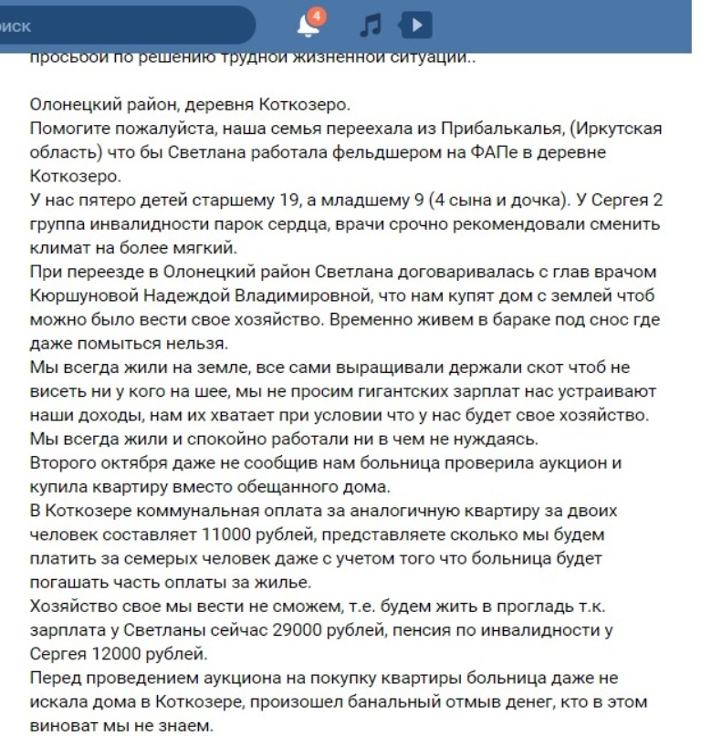 О своих злоключениях Светлана Корешкова активно рассказывает в соцсетях – она и зарегистрировалась «вконтакте» только пару недель назад. Суть ее претензий к карельским властям состоит в том, что она приехала в Олонецкий район под твердое обещание о покупке частного дома с приусадебным участком - ей и ее большой семье. Вместо дома многодетной семье выделили 40-метровую квартиру, в которой течет крыша, а коммуналка составляет минимум 11 тысяч рублей в месяц.
