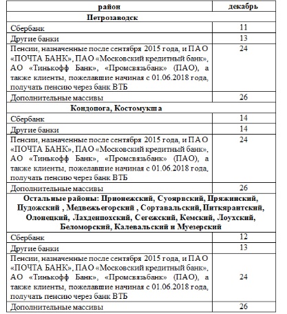 В Пенсионном фонде Карелии рассказали, когда жители республики получат пенсию и другие социальные выплаты за декабрь 2019 года. Так, петрозаводчане, согласившиеся на услуги "Сбeрбанка", смогут снять деньги уже 11 декабря, а обладатели карт других банков - 13 числа. Кондопожанам деньги поступят 14 декабря вне зависимости от наименования банка. Жители других районов республики смогут порадоваться поступившим выплатам 12 и 13 декабря. Финансирование осуществляется в предшествующий день.