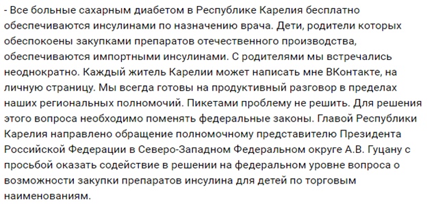 Кстати, так случилось, что в это самое время в правительство вошёл министр здравоохранения Михаил Охлопков. Позже на официальной странице Минздрава появился его комментарий на одиночный пикет против российских аналогов зарубежного инсулина – и он обнадеживает: