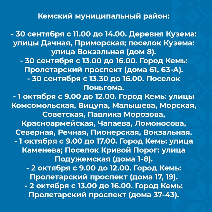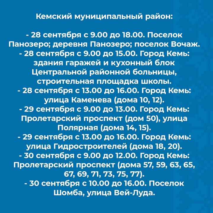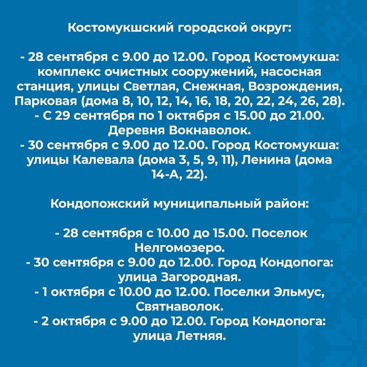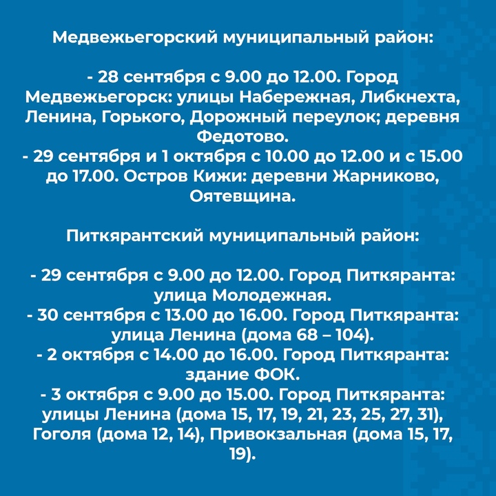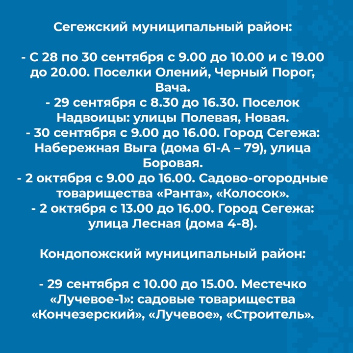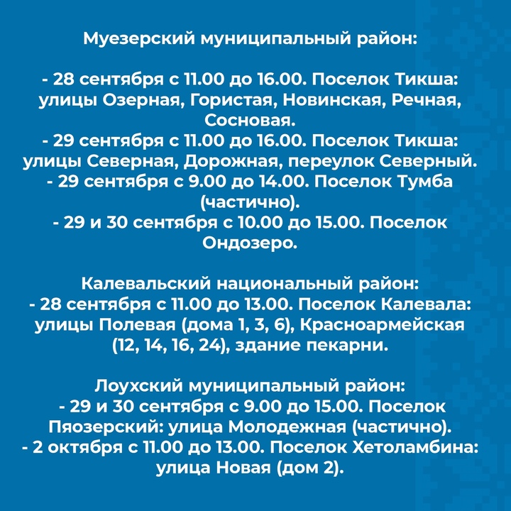 Так, на время без света могут остаться жители Сегежского, Кондопожского, Прионежского, Медвежьегорского, Питкярантского, Олонецкого, Муезерского, Калевальского, Лоухского, Костомукшского, Кондопожского и Кемского районов.