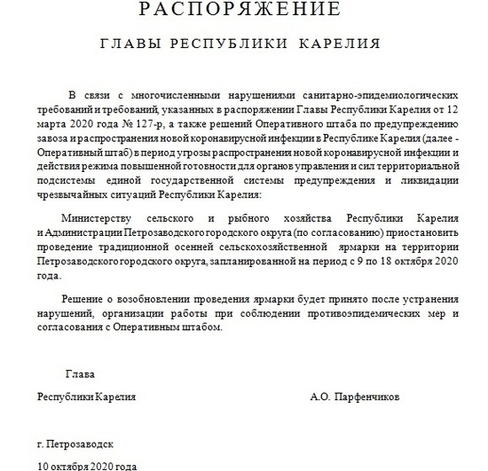 Открывшаяся 9 октября осенняя сельскохозяйственная ярмарка в Петрозаводске продержалась недолго: она проработала всего два дня. Накануне мероприятие на площадке у ТРЦ «Лотос Плаза» посетил глава Карелии Артур Парфенчиков и остался очень недоволен. Он рассказал о многочисленных нарушениях противоэпидемической безопасности: нет дистанции между некоторыми торговыми точками, покупатели ходят без защитных масок, продавцы без перчаток, допускается дегустация продуктов. Кроме того, изначально сообщалось, что на ярмарке будут исключительно карельские производители, но приехали представители и из других регионов и даже стран.
