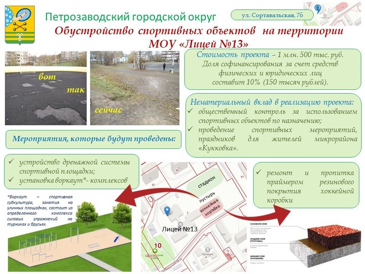 Так, в этом году с помощью ППМИ есть шанс преобразить территорию Машезерского сквера (там обустроят освещение и установят камеры видеонаблюдения), благоустроить парк мечты на территории средней школы № 8. Также можно проголосовать за благоустройство территории школы № 5, школы № 1 или же школы № 43. Организовать автомобильную стоянку около здания торгового центра «Ритм». Благоустроить главную площадь в Соломенном. Облагородить территорию Петровского Дворца и установить там спортивно-игровой комплекс. Обустроить спортивные объекты на территории лицея № 13.
