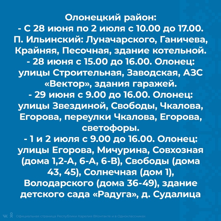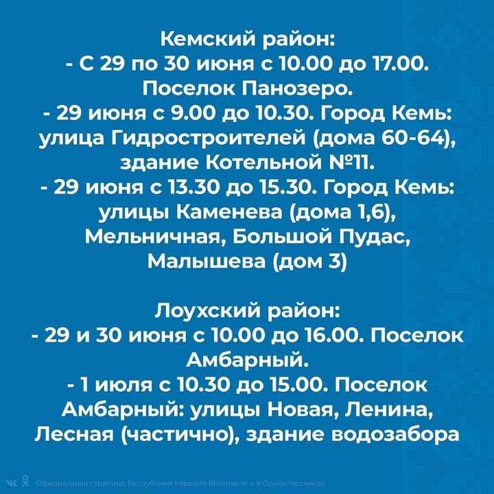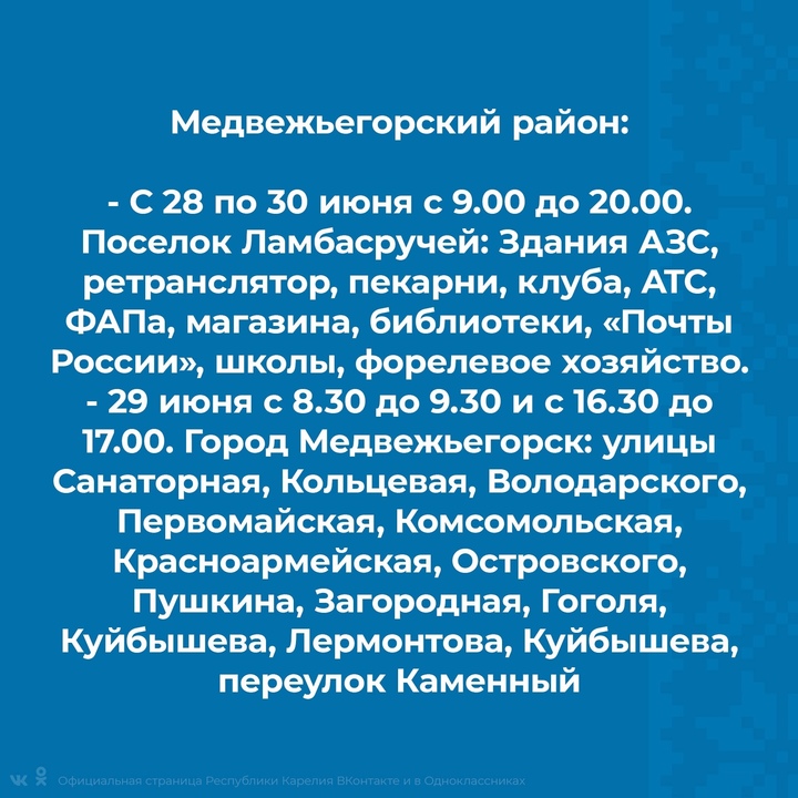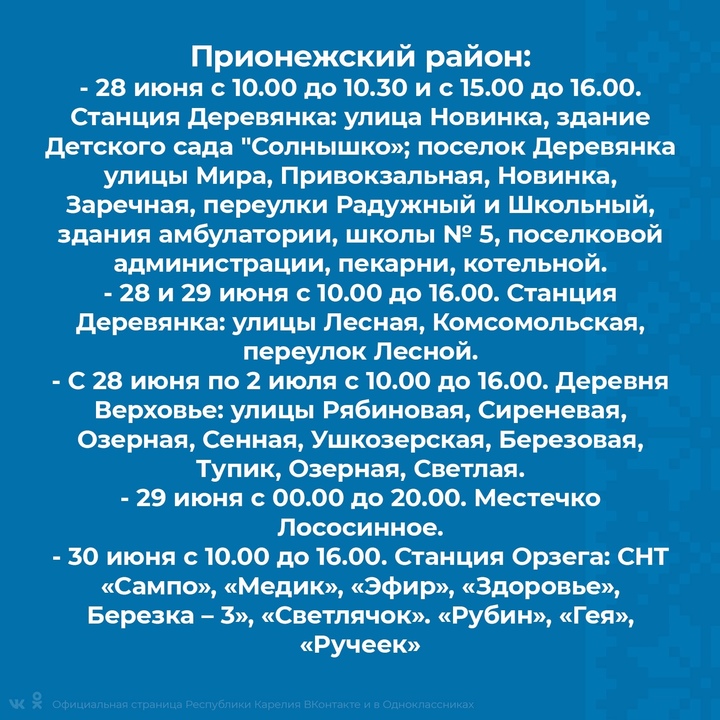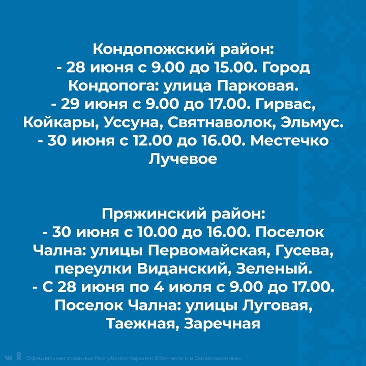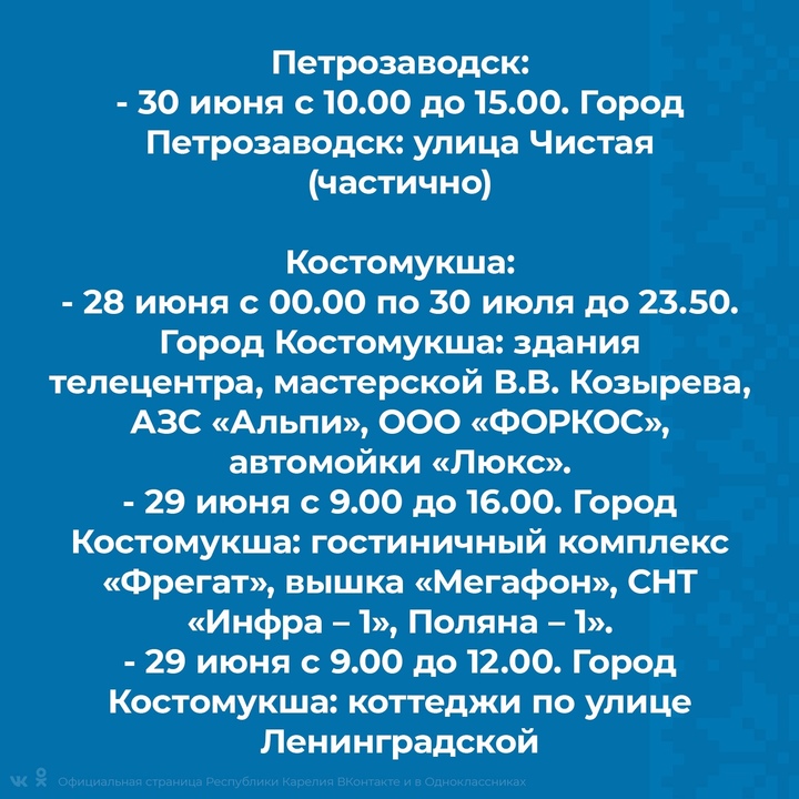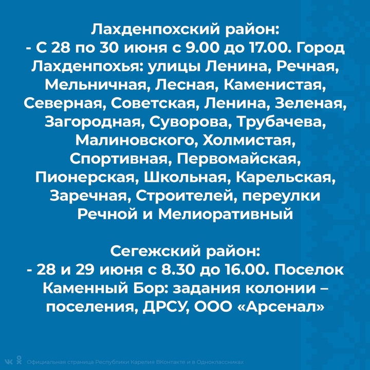 В разные дни без света на некоторое время останутся жители Лахденпохского, Сегежского, Кемского, Лоухского, Медвежьегорского, Прионежского, Олонецкого, Кондопожского, Пряжинского, Калевальского районов, Петрозаводска и Костомукши. Отключать электричество для проведения работ планируют утром и в дневное время.