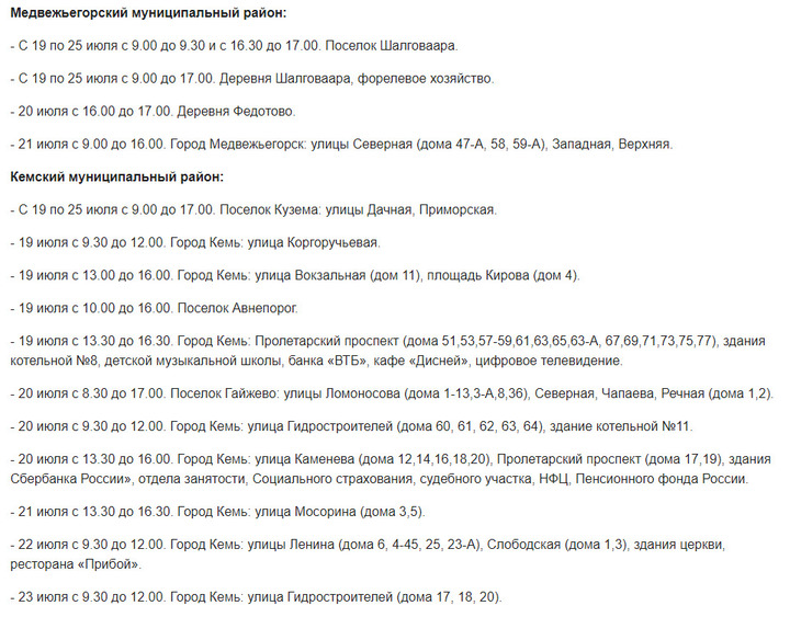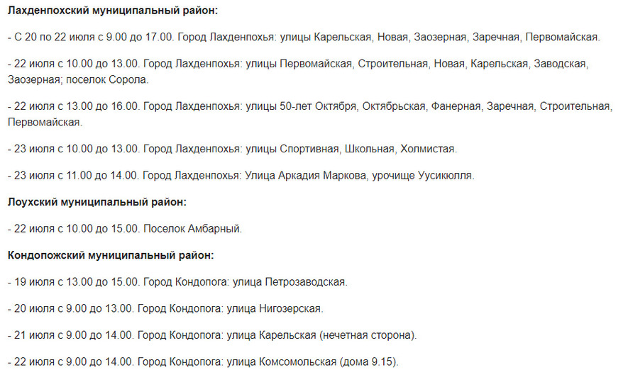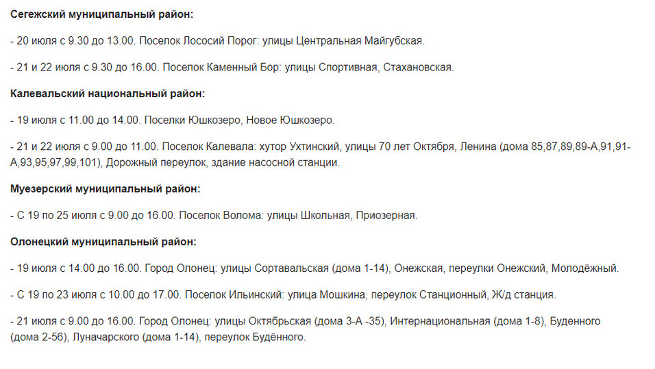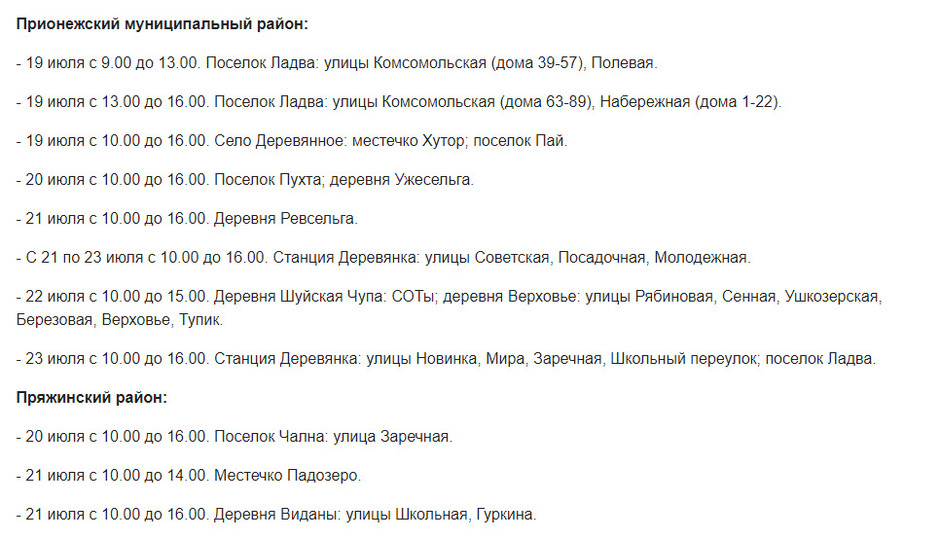 Временные отключения электричества возможны с 19 по 25 июля в следующих районах: