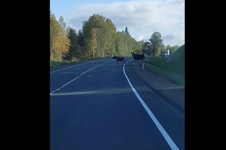 По всей видимости, на видео удалось запечатлеть лосиху и ее подросшего лосенка. К счастью, водители проезжающих в это время по дороге автомобилей успели затормозить и пропустить животных.