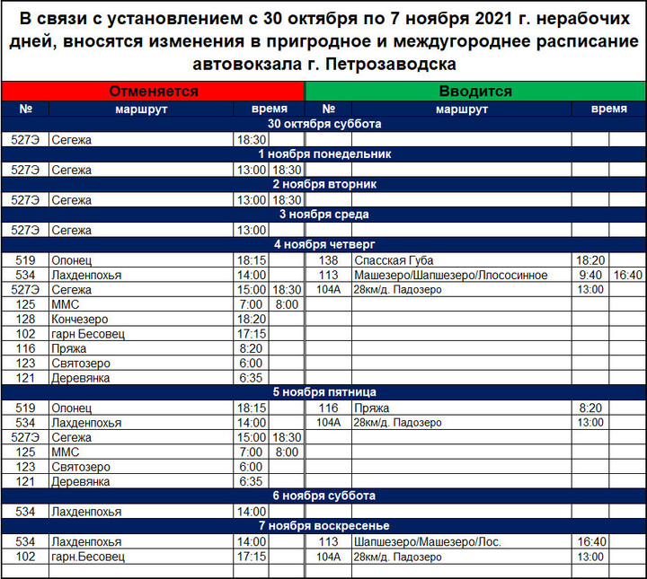 Автовокзал Петрозаводска опубликовал изменения в расписании автобусов  в нерабочие дни