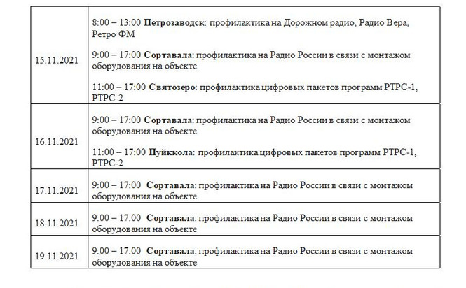 С 15 по 19 ноября в Карелии временно будут отключать трансляции теле- и радиосигнала. Об этом радиослушателей и телезрителей республики предупреждает Радиотелевизионный передающий центр РК.