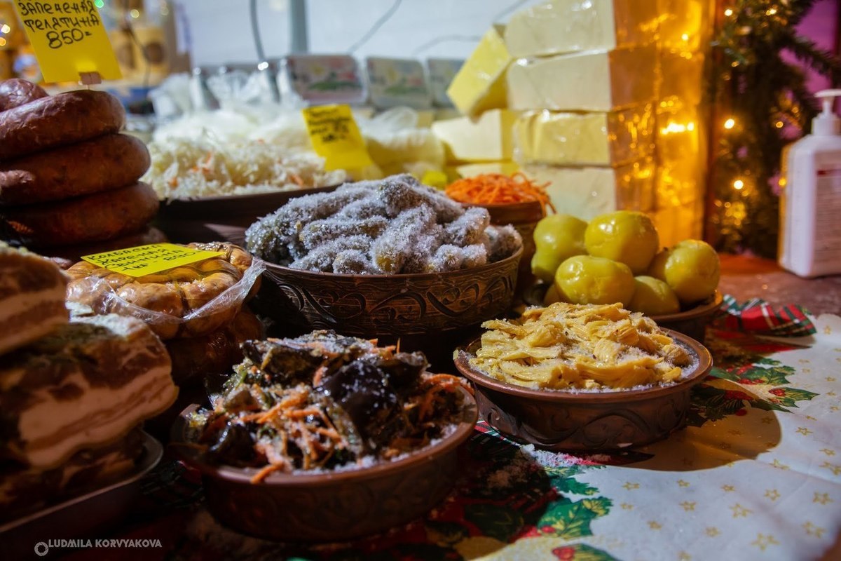 Торговые ряды представили «стандартный» набор продуктов и товаров: мурманскую рыбу, сало, белорусские колбасы, мед, уютные шапочки, варежки и другие вязаные вещи. Однако минусовая температура внесла свои коррективы: икра замерзала, хрумкие соленые огурцы начинали слегка заиндевать, а за мурманской селедкой в бочках, которую так любят многие петрозаводчане, нужен был глаз да глаз – селедка также норовила обледенеть. Но даже эти небольшие неурядицы не способны были охладить пыл продавцов или желание покупателей не уйти с ярмарки с пустыми руками. Естественно, на ярмарке можно приобрести и главный символ Нового года – пушистую, разлапистую и пахнущую лесом и чудесами ель.