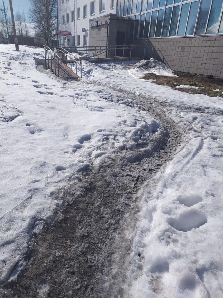 Пандус у здания почты есть, но проблема в том, что до этого пандуса еще надо добраться. Человеку на инвалидной коляске крайне сложно проехать туда по узким и кривым дорожкам, которые протоптали горожане. Автор поста задается вопросом: «Кто должен чистить снег?».
