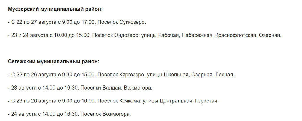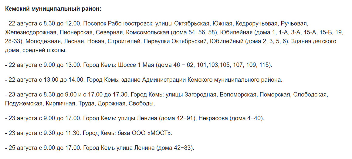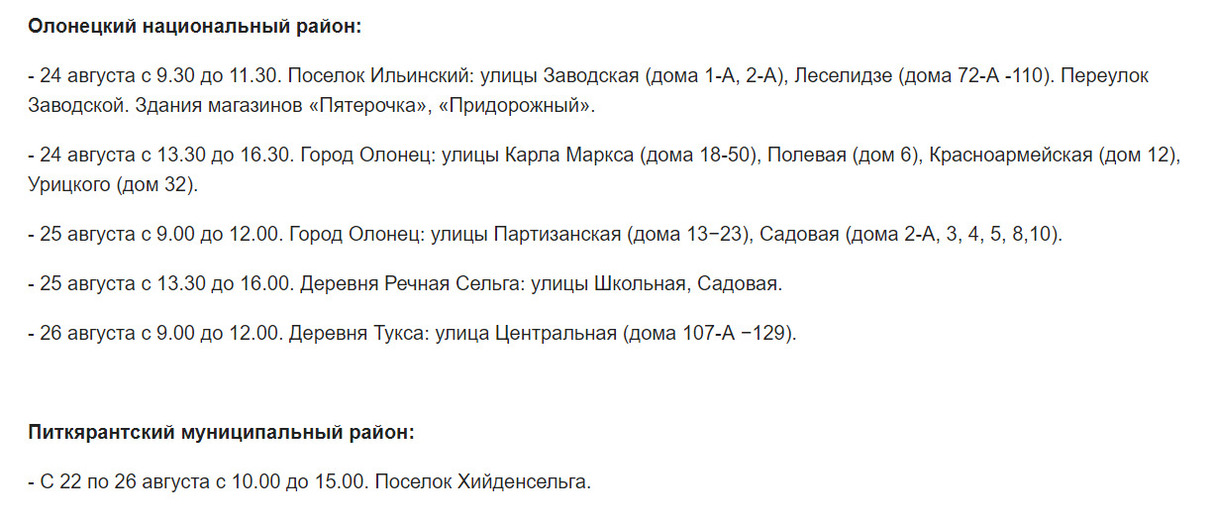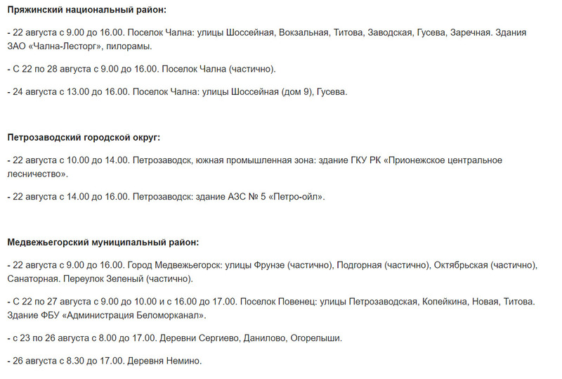 На этот раз без электричества могут остаться жители 11 районов и Петрозаводского городского округа. Под отключения попадут населенные пункты Калевальского, Лоухского, Кондопожского, Муезерского, Сегежского, Кемского, Олонецкого, Питкярантского, Медвежьегорского, Пряжинского и Прионежского районов.