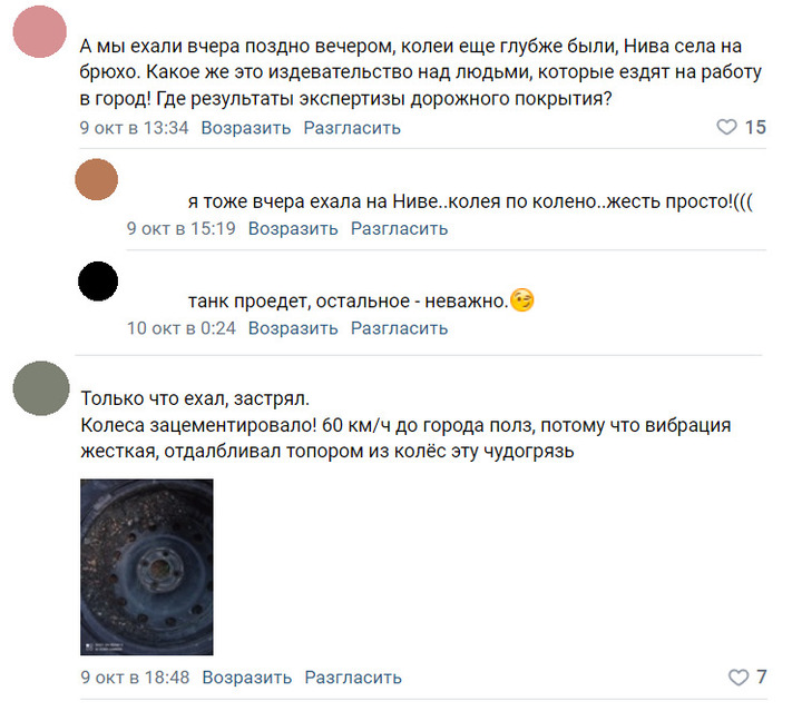 В комментариях к последнему посту жители Карелии рассказывают, как у кого-то на новой дороге «машина села на брюхо, а у кого-то и вовсе «колеса зацементировало», поэтому пришлось топором выдалбливать из них «чудогрязь».