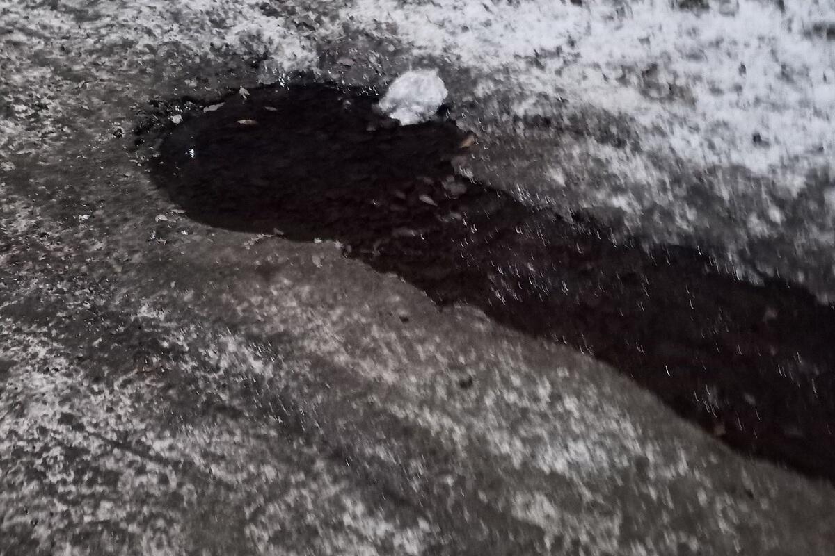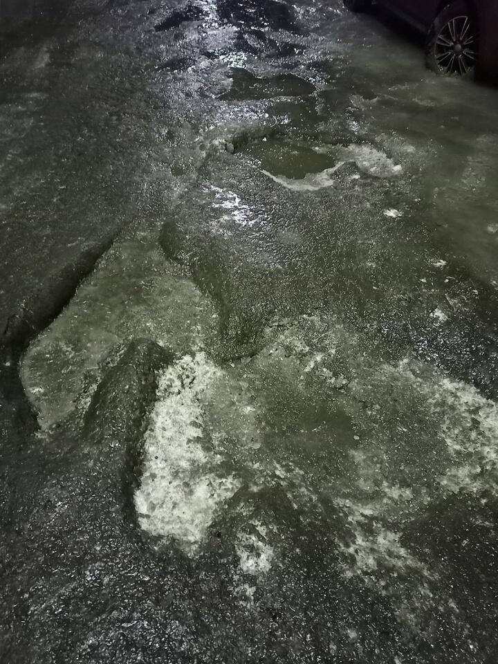 Тем временем улица успела превратиться в каток, припаркованные машины «вмерзли» в лед, а на дороге образовались ямы с ледяными наростами.