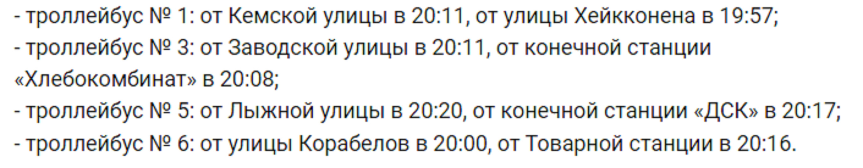 ПМУП «Городской транспорт» информирует жителей Петрозаводска о том, что троллейбусы будут ходить по непривычному расписанию с 31 декабря по 8 января. Так, 31 декабря электротранспорт будет следовать по графику субботы, последние «рогатые» вернутся в депо в 21:40.