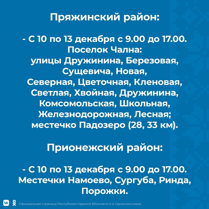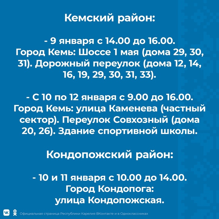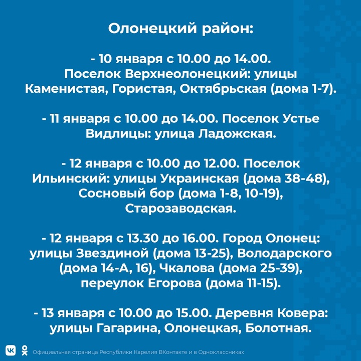 С 9 по 15 января возможны краткосрочные отключения в 5 муниципальных районах Карелии. Провести некоторое время без электричества предстоит жителям Кемского, Кондопожского, Олонецкого, Пряжинского и Прионежского районов. Полный график отключений публикуем ниже: