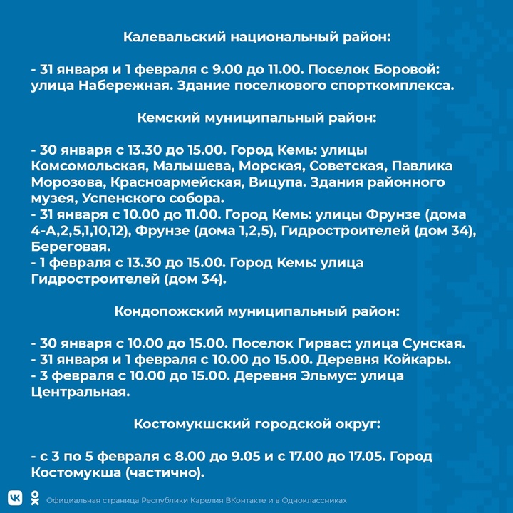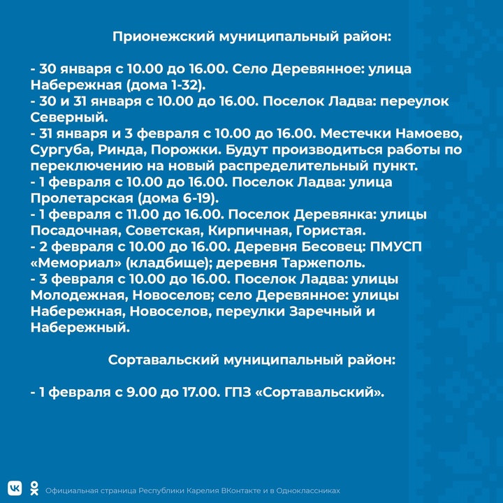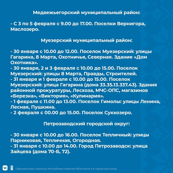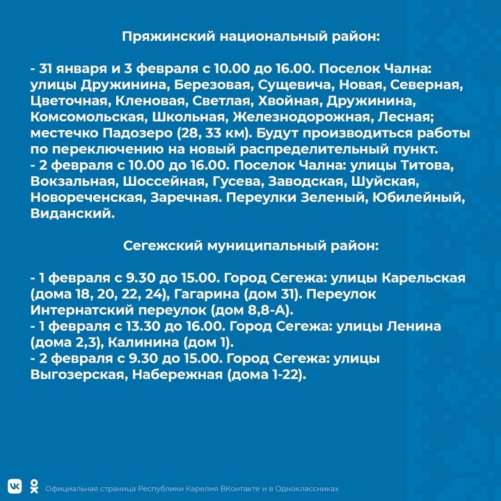 Уточняется, что временные отключения света стоит ждать с 30 января по 5 февраля. Провести некоторое время без электричества предстоит жителям 9 районов и двух городских округов. В разные дни отключения света запланированы в Петрозаводске, Костомукше, Прионежском, Пряжинском, Муезерском, Сортавальском, Кемском, Калевальском, Кондопожском, Медвежьегорском и Сегежском районах. Свет будут отключать преимущественно утром и в дневное время.