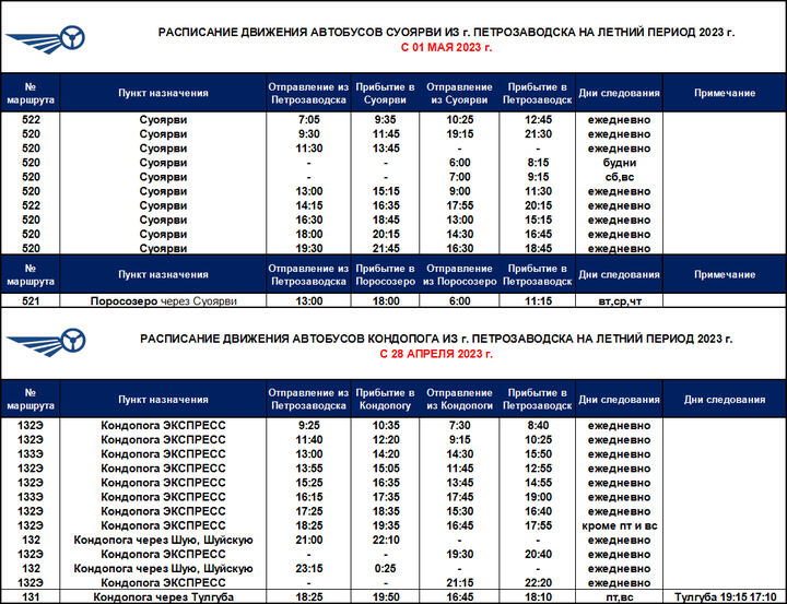 В группе “Карелавтотранса” опубликовали летнее расписание автобусов, следующих в Кондопожском и Суоярвском направлениях. Пассажиров предупредили, что перевод рейсов по двум направлениям на летний график запланирован не с 25 апреля. Автобусы Кондопожского направления начнут курсировать по летнему расписанию с 28 апреля, а Суоярвского – с 1 мая.