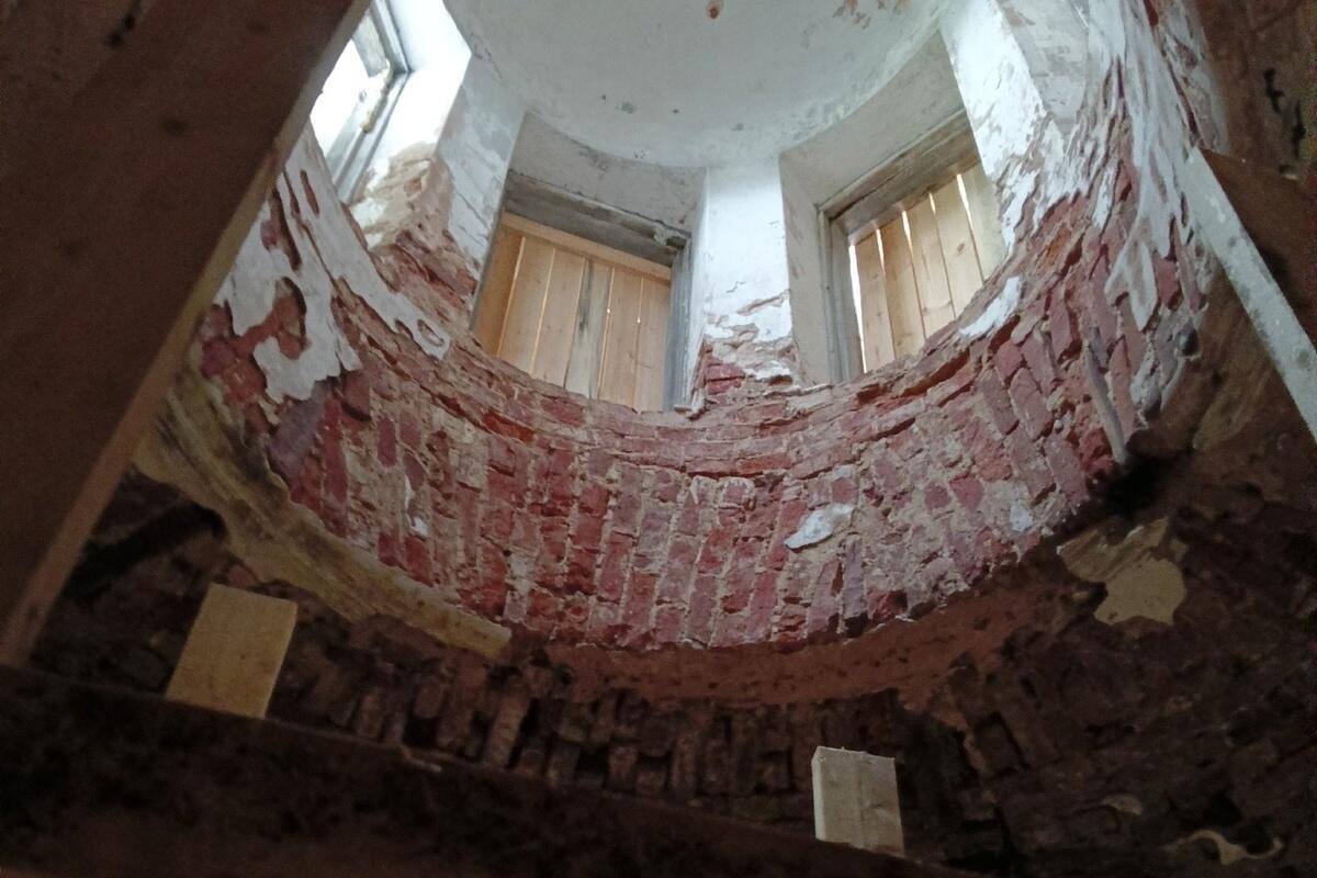 Благодаря поднятым строительным лесам теперь можно рассмотреть остатки росписи купола, очертания верха иконостаса, а также изучить деформации арок.