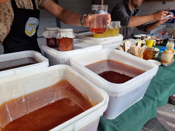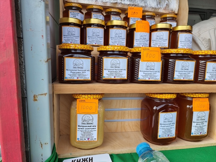 Посетители могут купить мед в банках, бочонках и в сотах, а также прополис. Цены разные, в зависимости от веса и объема.