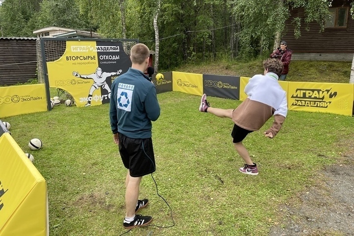 Игрокам нужно было отправить мячи в нужные отсеки, обозначающие либо вторсырье, либо неперерабатываемые отходы. Отсеки окрашены в два цвета: желтый для вторсырья, серый – для смешанных отходов. Цвета выбрали не случайно – в такие же цвета окрашены контейнеры для сбора отходов в Петрозаводске.
