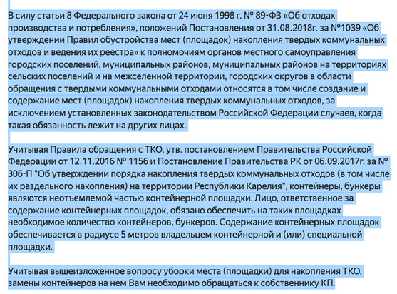 «Карельский экологический оператор» ответил на жалобу жителей центра Петрозаводска на помойку у дома на проспекте Ленина, 13. Как рассказал «МК в Карелии» местный житель, мусорный оператор рекомендует найти лицо, ответственное за содержание контейнерной площадки: