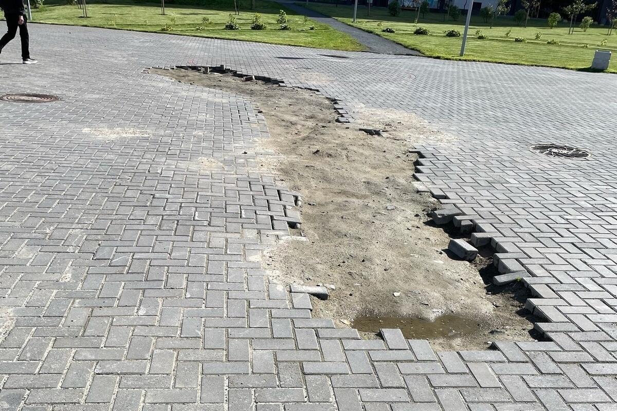 Местные жители жалуются, что рабочие ежегодно выкапывают на этом месте ямы. В этом году они устроили раскопки в начале лета, а после завершения работ не восстановили брусчатку.