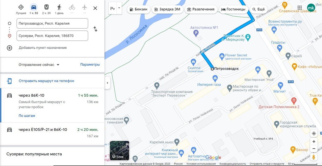 При этом если строить этот маршрут в Яндекс-картах или Гугл-картах, «нулевой километр» будет совершенно в разных местах. В первом случае расстояние отсчитывается от площади Гагарина, во втором – от непонятного места между улицей Лизы Чайкиной и набережной Ля Рошели.