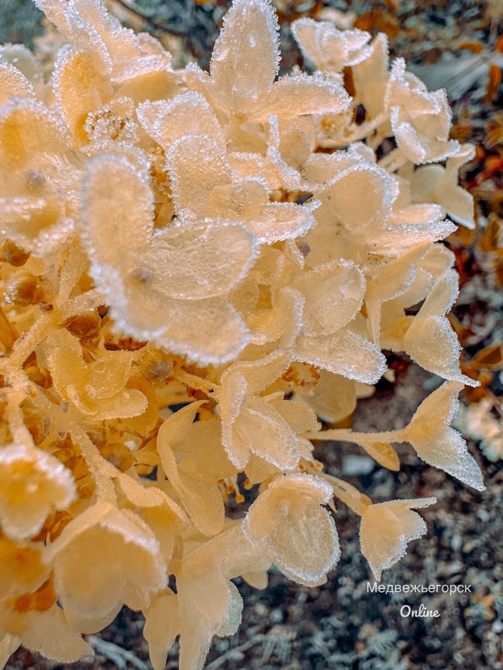 На фотографиях видно, как цветы и листья деревьев покрылись инеем, напоминающим белую ледяную кайму, покрывшую контуры растений.