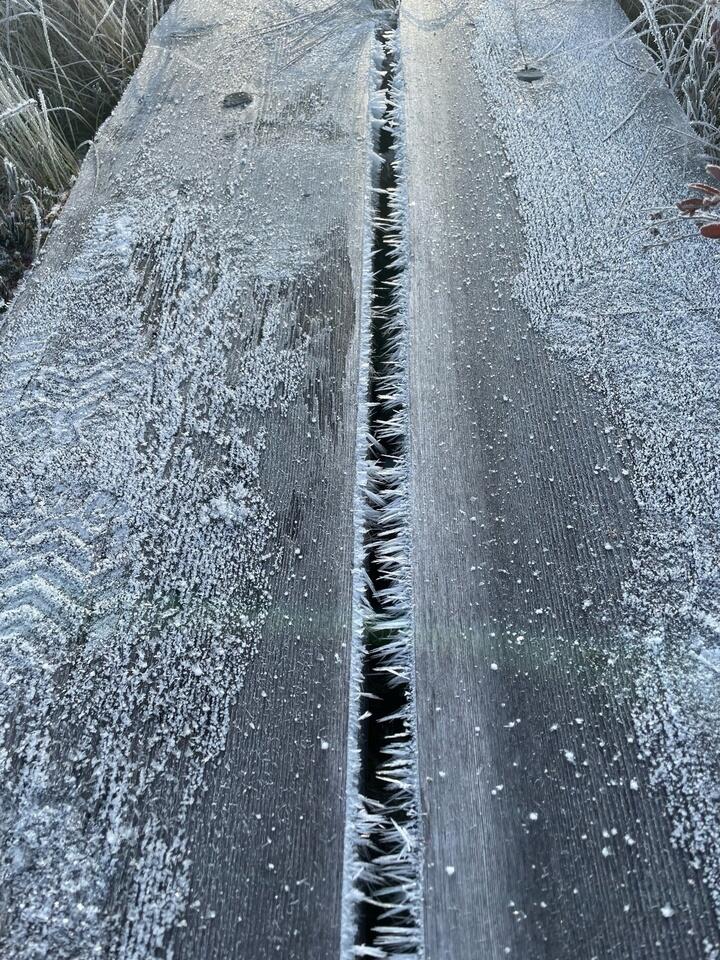 Покрытые инеем растения и дощечки тропы оказались особенно очаровательны в лучах осеннего солнца.