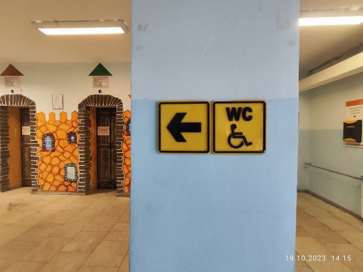 Если человек ездит на коляске и у него возникнут проблемы с проездом в поликлинику или больницу, то для него есть кнопка вызова помощи: вахтёр получит сигнал и откроет дверь. Также у входа всегда стоит коляска, которой можно воспользоваться при необходимости.